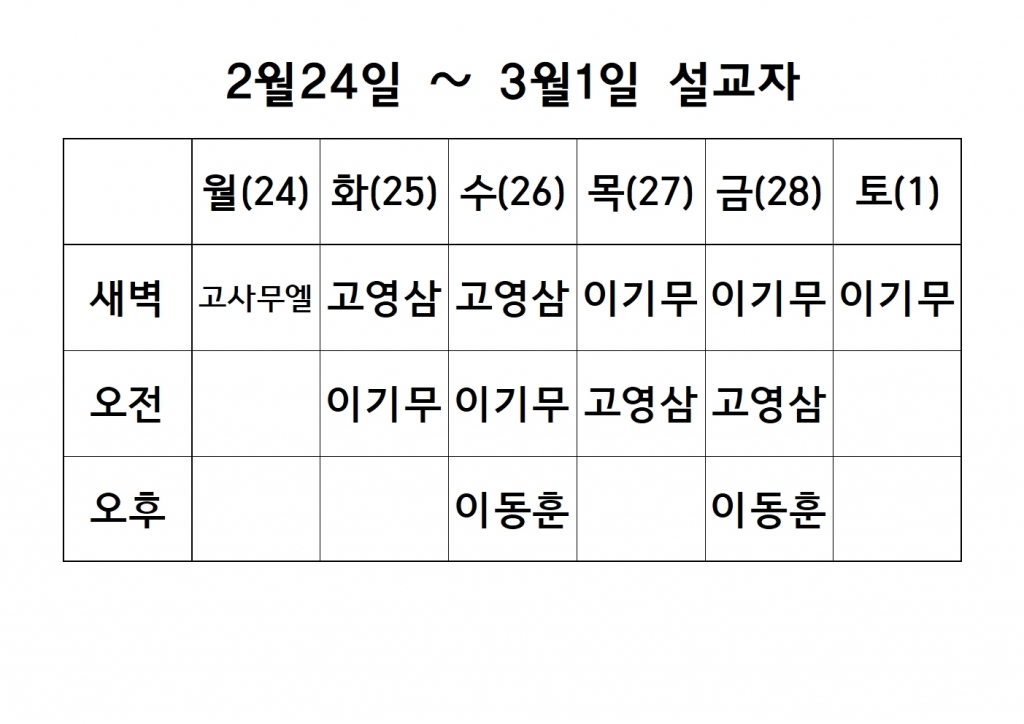 599 [집회설교자]2026년 3월2일 ~ 3월7일 설교자명단(부활절 감사기념 특새 2주차)  이지현 2026-02-27 86